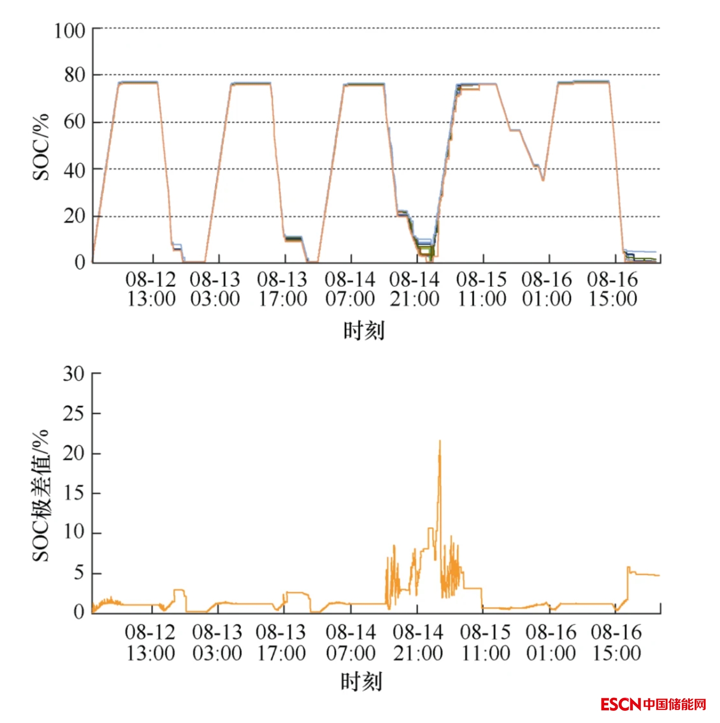 針對(duì)儲(chǔ)能的日常運(yùn)行數(shù)據(jù),在云端對(duì)儲(chǔ)能數(shù)據(jù)進(jìn)行分析,評(píng)估診斷儲(chǔ)能性能,篩選偏離正常范圍及判定離群的電池電芯。圖6所示為儲(chǔ)能荷電狀態(tài)(state of charge, SOC)運(yùn)行曲線及其極差值,由于電池包內(nèi)部電芯本身差異、溫度差異等的不一致,導(dǎo)致電池簇之間的SOC存在差異。