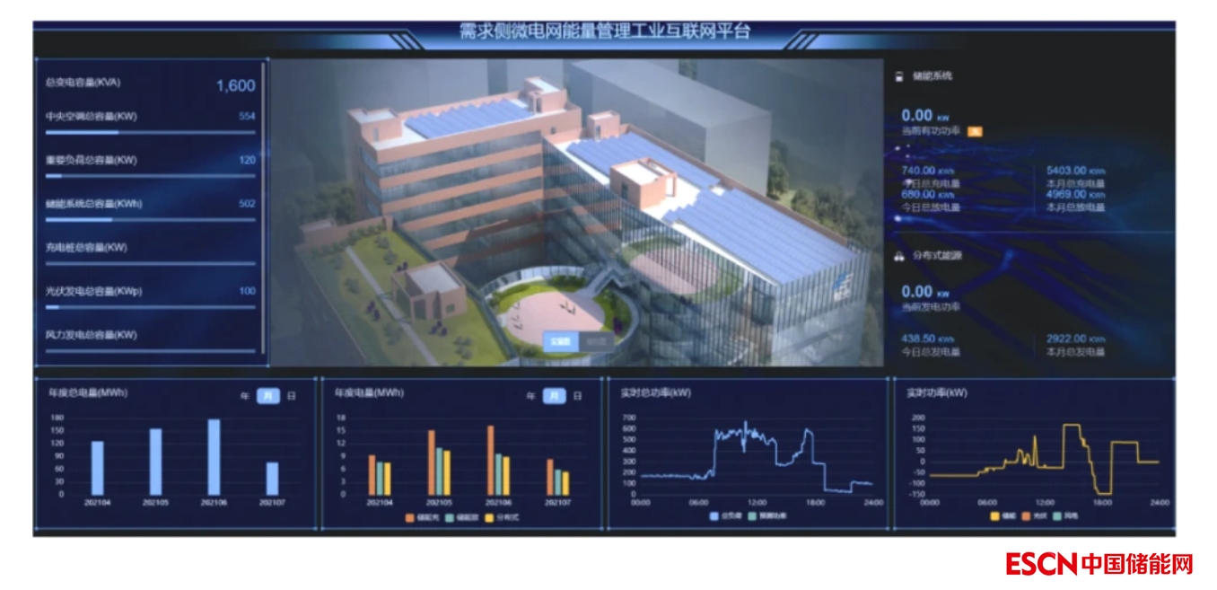 在某園區(qū)建設(shè)了包含儲(chǔ)能、光伏、數(shù)據(jù)中心、充電樁等的需求側(cè)微電網(wǎng)能量管理工業(yè)互聯(lián)網(wǎng)平臺(tái),實(shí)現(xiàn)園區(qū)綜合能源的削峰填谷、需量控制、節(jié)能運(yùn)行等應(yīng)用。光伏裝機(jī)容量100kWp,儲(chǔ)能系統(tǒng)裝機(jī)容量245kW/502kW·h,中央空調(diào)包含355kW離心機(jī)和199kW螺桿機(jī),數(shù)據(jù)中心作為重要負(fù)荷24h運(yùn)行,功率維持在120kW左右。儲(chǔ)能系統(tǒng)由多個(gè)儲(chǔ)能子系統(tǒng)并聯(lián),接入AC380V配電網(wǎng)。