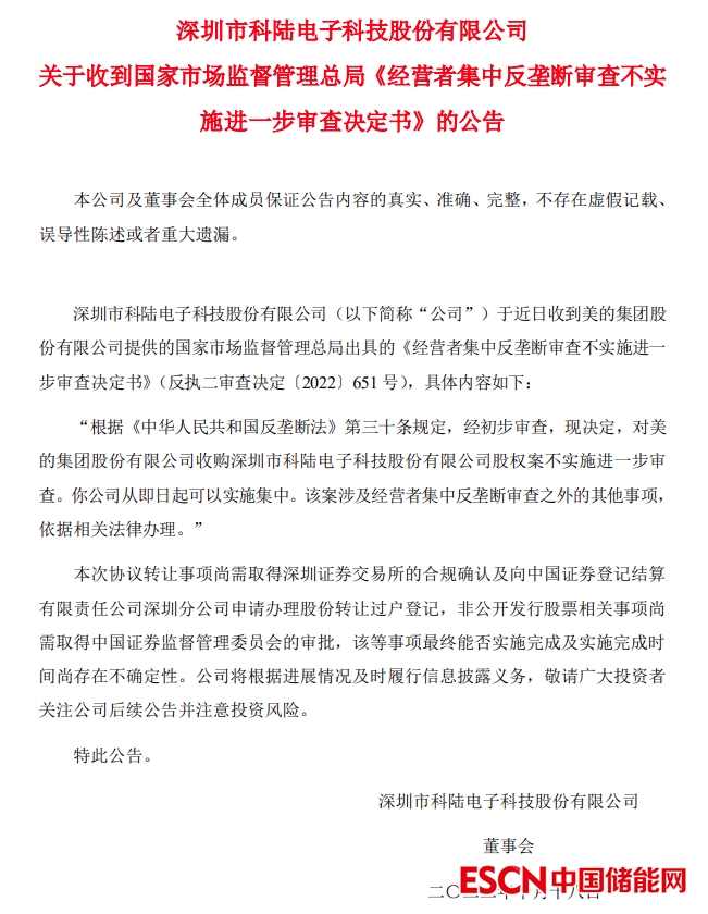 公告顯示,科陸電子于近日收到美的集團股份有限公司提供的國家市場監(jiān)督管理總局出具的《經(jīng)營者集中反壟斷審查不實施進一步審查決定書》,具體內(nèi)容如下: