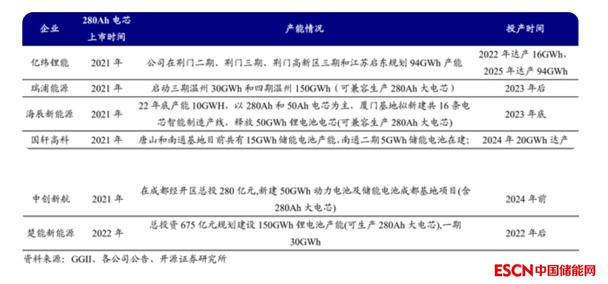 也正是在這種情況下,280Ah電芯已成為電池廠商的布局重點之一。據(jù)GGII不完全統(tǒng)計,寧德時代、億緯鋰能、中創(chuàng)新航、國軒高科等11家公司已有相關擴產(chǎn)計劃。