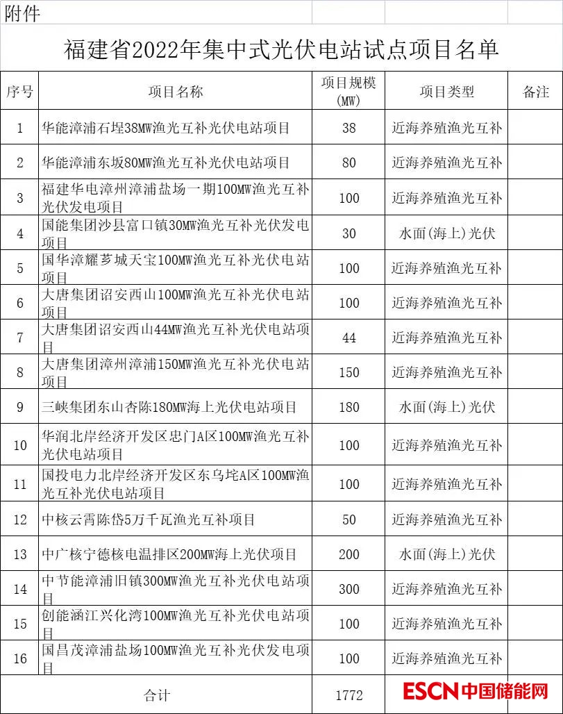 中國儲能網(wǎng)訊:10月20日,福建省發(fā)改委發(fā)布《2022年集中式光伏電站試點項目名單的通知》,共計16個項目,規(guī)模為1.772GW。