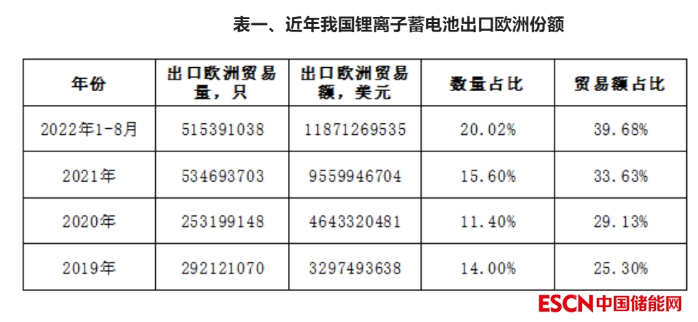 一、歐洲一直是我國(guó)鋰離子電池產(chǎn)品出口的主要目的地,2022年從貿(mào)易額上看已成為我國(guó)鋰離子電池產(chǎn)品出口的最大目的地。我國(guó)海關(guān)數(shù)據(jù)顯示,2019年–2021年,我國(guó)鋰離子蓄電池出口到歐洲的數(shù)量占出口總量的15%左右;出口額逐年增加,占比在30%左右。2022年1–8月,貿(mào)易量和貿(mào)易額占比分別提高到20%和40%,與歐洲的貿(mào)易量?jī)H次于亞洲地區(qū),貿(mào)易額則排名第一。歐洲已成為我國(guó)鋰離子電池出口的最大目的地,對(duì)我國(guó)鋰離子電池企業(yè)來說是非常重要的市場(chǎng)。