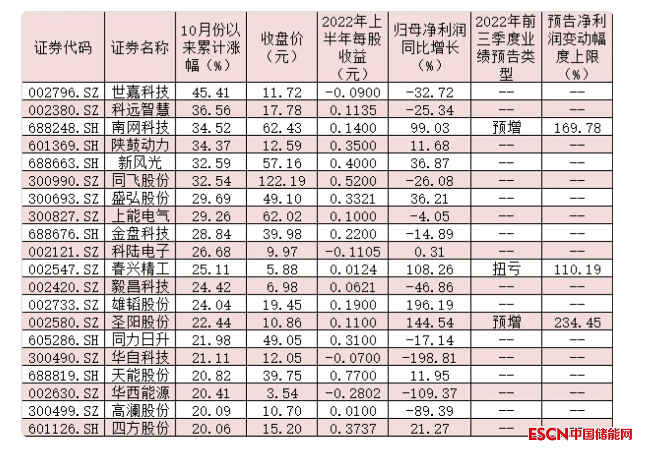表:10月份以來累計漲幅超20%的儲能概念股