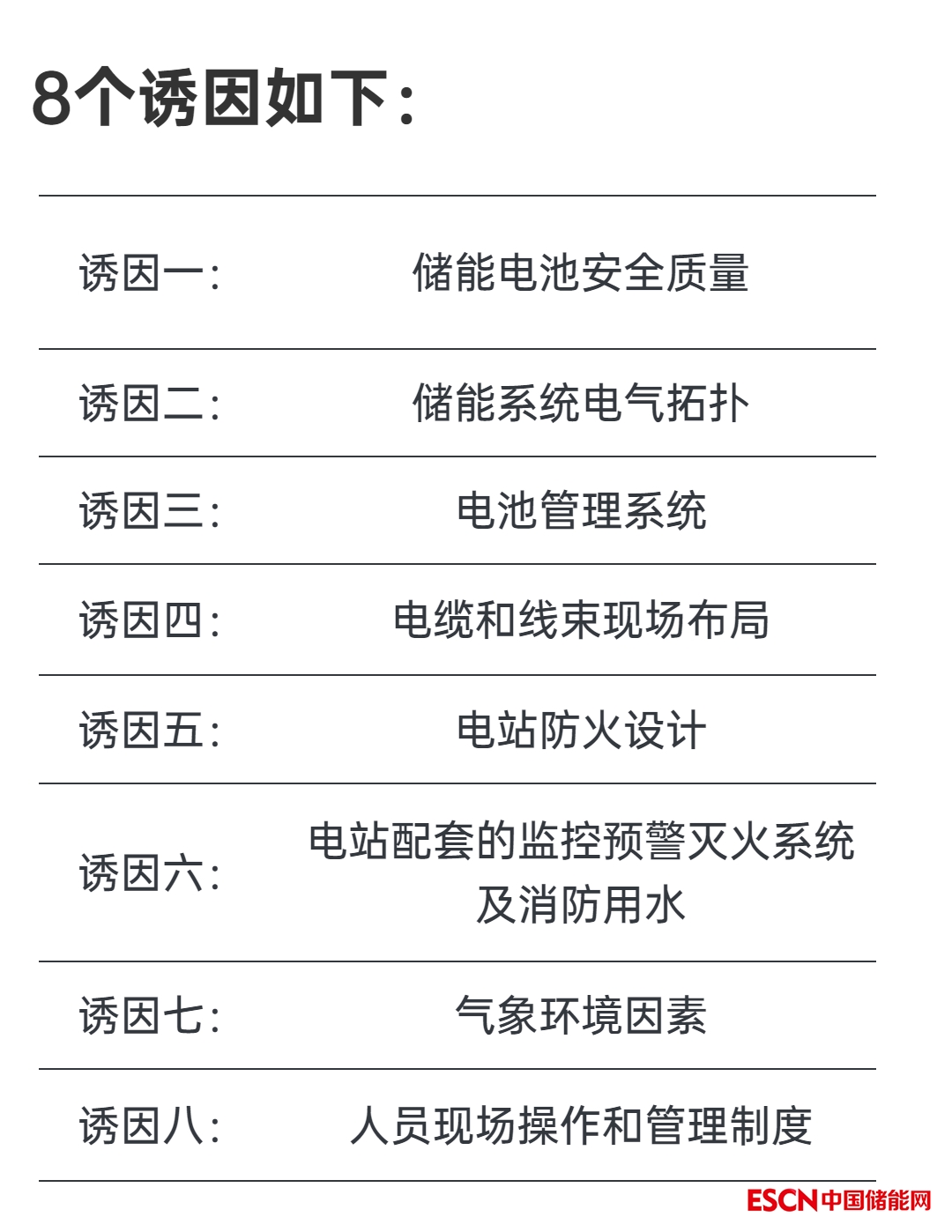 去年,北京儲能電站發(fā)生爆炸事故引發(fā)了社會對儲能電站安全問題的關(guān)注。國家電網(wǎng)直屬科研單位,中國電力科學(xué)研究院有限公司儲能與電工新技術(shù)研究所,發(fā)布了對該事故的分析報告,提出了可能引發(fā)爆炸的8個誘因,包括儲能電池安全質(zhì)量、電池管理系統(tǒng)和氣象環(huán)境因素等。