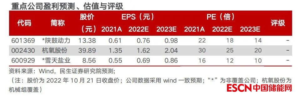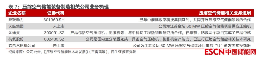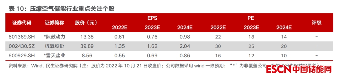 未來能源結構中,風光等新能源占比將不斷提升,為保證電能供應質量,電力系統(tǒng)對儲能的需求日益提升,大規(guī)模、長時儲能需求中,壓縮空氣儲能綜合性能領先,隨政策支持釋放及產(chǎn)業(yè)鏈成本下降,裝機規(guī)模有望快速增長,產(chǎn)業(yè)鏈核心環(huán)節(jié)的優(yōu)質公司有望受益。建議關注裝備制造環(huán)節(jié)的陜鼓動力、金通靈、杭氧股份等,以及鹽穴資源領域的魯銀投資、蘇鹽井神、雪天鹽業(yè)等。