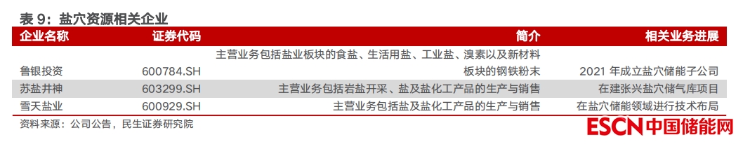 鹽業(yè)企業(yè)積極布局鹽穴儲能。我國地下鹽巖分布范圍廣,埋深由數(shù)十米至1000m不等。與國外相比較,我國鹽巖具有礦層層數(shù)多、單層厚度薄的特點,并且鹽巖中多存在鈣芒硝、硬石膏和泥巖夾層等,需滿足相關地質條件才適合建設鹽穴地下儲庫。我國鹽業(yè)上市公司中,魯銀投資、蘇鹽井神、雪天鹽業(yè)等均在鹽穴儲能領域有所布局。