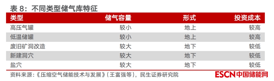 現(xiàn)有壓縮空氣儲能項目主要采用地下儲氣庫。壓縮空氣儲能儲氣庫包括高壓氣罐、低溫儲罐、廢舊礦洞改造、新建洞穴、鹽穴等多種形式。其中,地上儲氣庫(高壓氣罐和低溫儲罐)目前多處于試驗階段,成本相對較高,現(xiàn)階段在建、已投產(chǎn)項目多采用地下儲氣庫(廢舊礦洞改造、新建洞穴、鹽穴)。