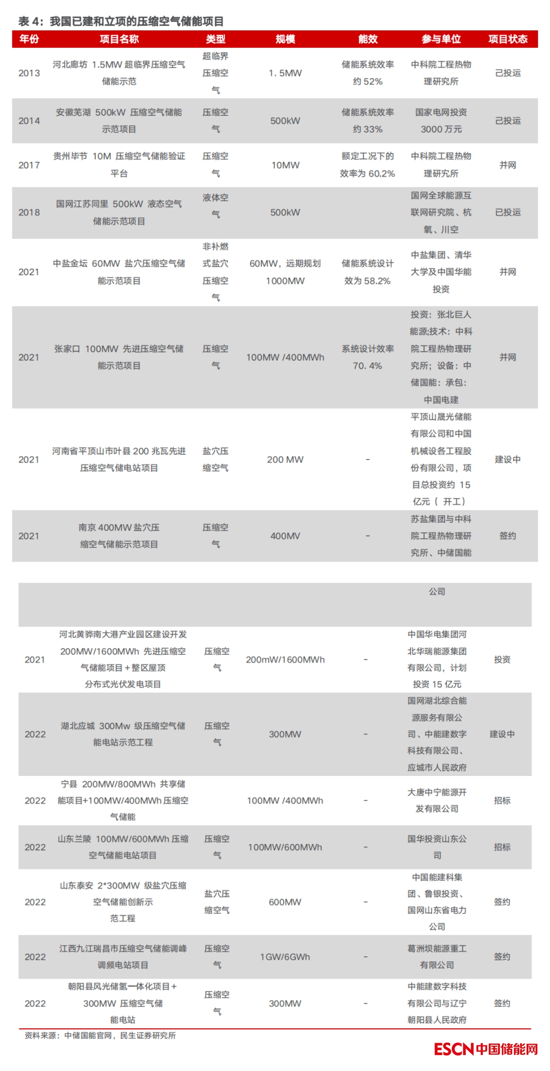 壓縮空氣儲能正從示范應用向產(chǎn)業(yè)化初期邁進。我國2022年已經(jīng)立項規(guī)劃規(guī)模最大的1GW壓縮空氣項目,為葛洲壩能源重工參與的江西九江瑞昌市調頻調峰電站項目。目前國內陸續(xù)進行了壓縮空氣、超臨界壓縮空氣、液態(tài)壓縮空氣儲能項目的研發(fā)與建設(見表4),總體研發(fā)能力已處于國際領先水平,雖比歐美起步晚,但發(fā)展速度較快。根據(jù)中國化學與物理電源行業(yè)協(xié)會儲能應用分會發(fā)布的《2022儲能產(chǎn)業(yè)應用報告》統(tǒng)計分析,2021年全球新增壓縮空氣儲能項目裝機功率共191MW,占全球儲能比例1.4%;而中國新增高達190MW,占中國儲能比例2.6%。