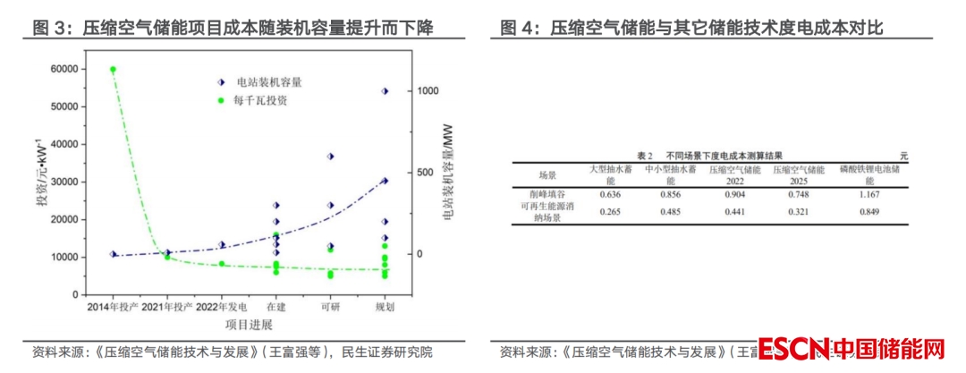 壓縮空氣儲能投資成本隨裝機容量提升而下降。2014年,國內首個投運的壓縮空氣示范項目蕪湖500kW電站,單位投資成本約6萬元/kW;2021年投運的肥城一期10MW電站,單位投資成本已降至1萬元/kW。根據(jù)《壓縮空氣儲能技術與發(fā)展》報告中統(tǒng)計,針對部分可研階段和規(guī)劃階段的壓縮空氣儲能項目,預計未來投資成本可降至0.5~0.6萬元/kW,與大型抽水蓄能電站相當。