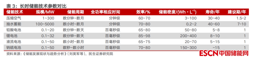 隨著新能源發(fā)電比例提升,容量型儲能需求快速增長。以風電、光伏為代表的可再生能源在分鐘、小時、連續(xù)數(shù)天甚至跨季節(jié)等不同時間尺度上具有波動性和間歇性的特點,因此需要匹配不同時長的儲能技術。目前新能源側配置儲能系統(tǒng)通常以功率型或能量型為主,主要起到平滑功率波動的作用。隨著新能源裝機規(guī)模快速增長,其在發(fā)電結構中占比提升,對儲能時長的要求越來越高,容量型儲能的需求日益增長。
