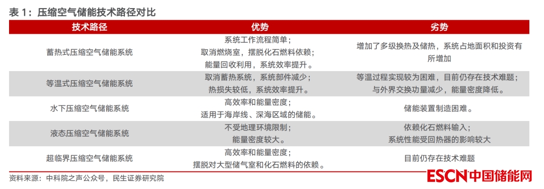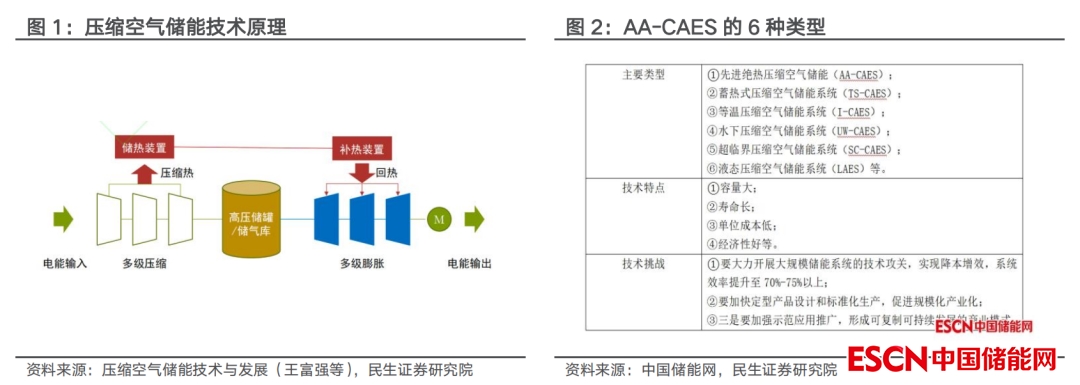 新型壓縮空氣儲能技術迅速發(fā)展,儲能系統(tǒng)擺脫對化石燃料的依賴,效率提升。在能源行業(yè)存儲、技術驅動方面,為碳中和、構建新型電力系統(tǒng)提供有力支持,新型壓縮空氣儲能系統(tǒng)用蓄熱裝置代替?zhèn)鹘y(tǒng)壓縮空氣儲能系統(tǒng)的燃燒室,擺脫了對天然氣、石油等化石燃料的依賴,可實現(xiàn)對環(huán)境的零排放,零污染。國內外學者在傳統(tǒng)壓縮空氣儲能的基礎上,開拓出了多種新型的壓縮空氣儲能技術,使其得到迅速發(fā)展,目前主要的壓縮空氣儲能技術包括蓄熱式壓縮空氣儲能系統(tǒng)、等溫壓縮空氣儲能系統(tǒng)、水下壓縮空氣儲能系統(tǒng)、液態(tài)壓縮空氣儲能系統(tǒng)、超臨界壓縮空氣儲能系統(tǒng)等。其中蓄熱式壓縮空氣儲能系統(tǒng)效率較高,具備較為成熟的技術,加之我國有大量的鹽洞、廢棄礦洞,該系統(tǒng)技術發(fā)展前景較為廣闊。