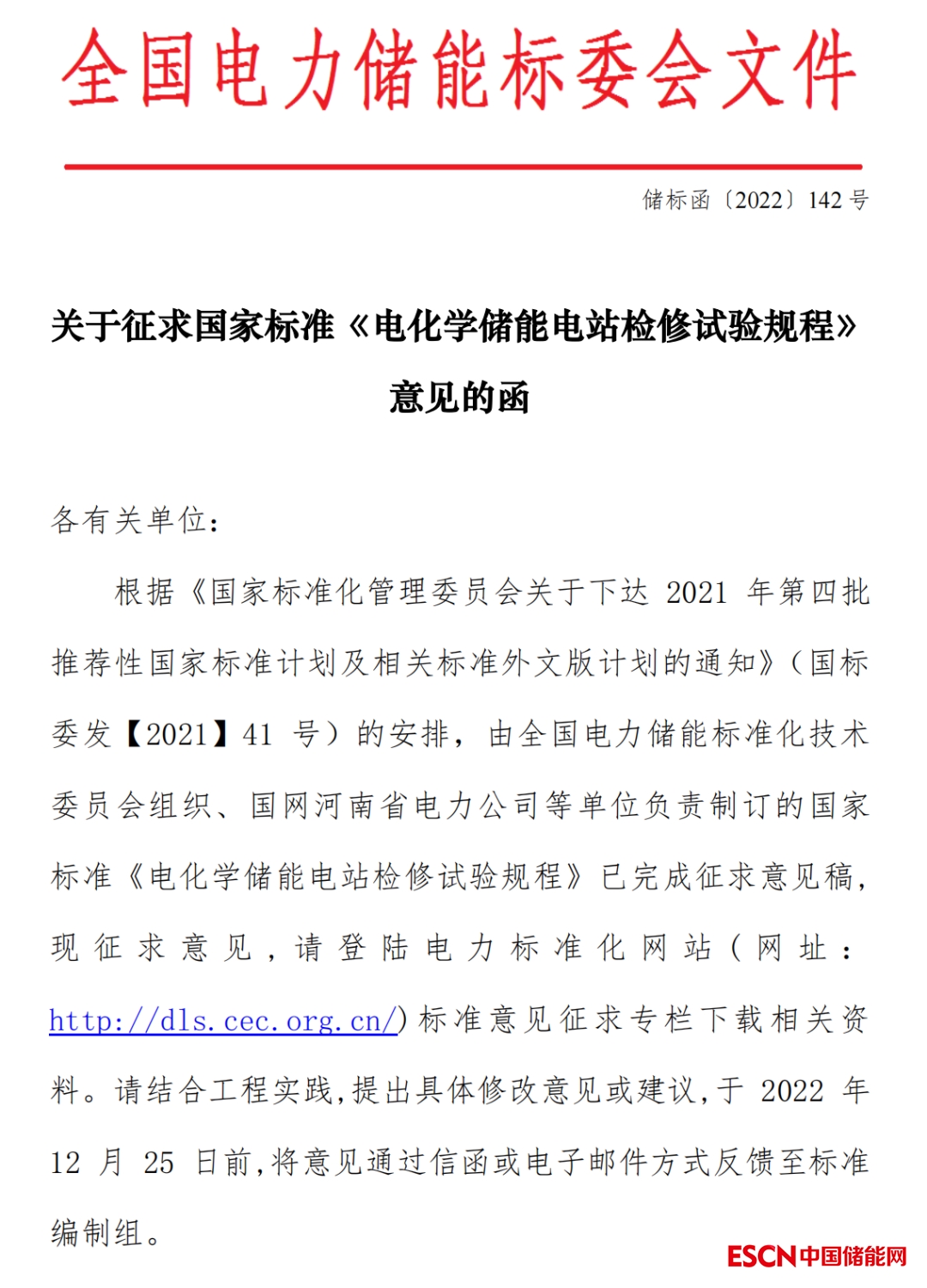 關(guān)于征求國(guó)家標(biāo)準(zhǔn)《電化學(xué)儲(chǔ)能電站檢修試驗(yàn)規(guī)程》意見的函