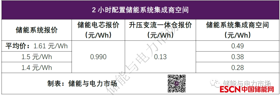 以本項目中電芯平均價為參考,刨去儲能系統(tǒng)電芯+升壓變流一體倉總成本1.120元/Wh(0.99+0.13),在不同的報價水平下,儲能集成商的實際空間如下表。