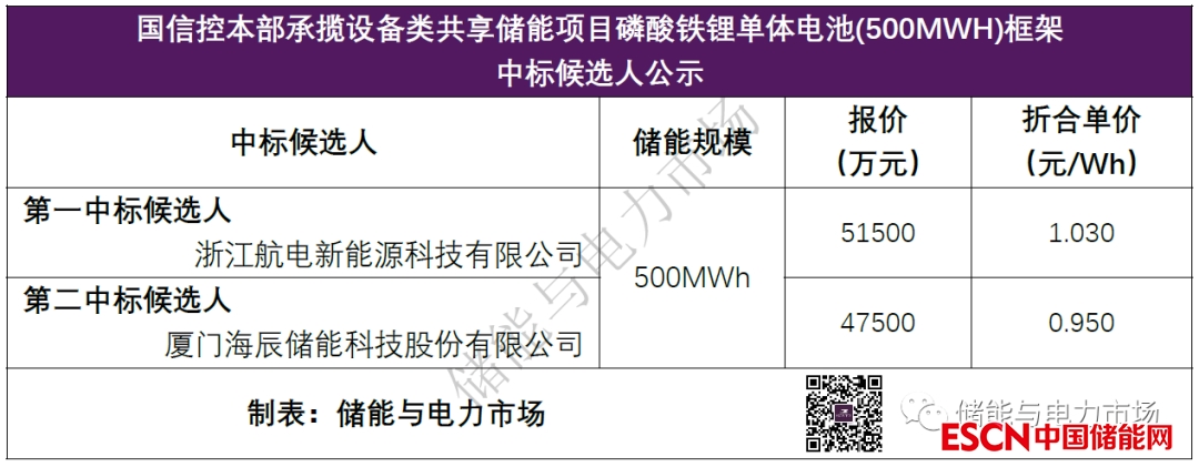 中國儲能網訊:近日《國信控本部承攬設備類共享儲能項目磷酸鐵鋰單體電池(500MWH)框架中標候選人公示》對外發(fā)布,浙江航電新能源科技有限公司以總報價51500萬元,折合單價1.03元/Wh,成為第一中標候選人。中標候選人情況如下表所示。