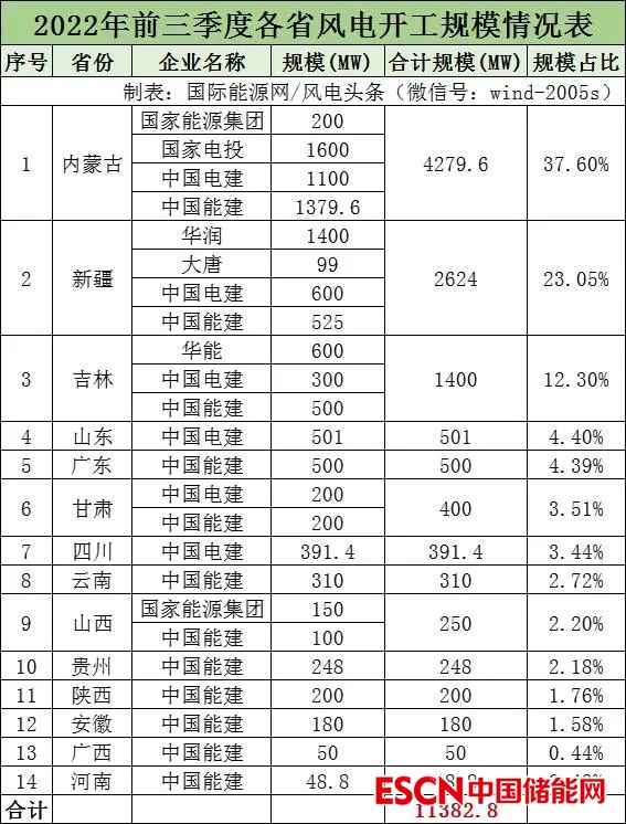 國際能源網(wǎng)/風電頭條(微信號:wind-2005s)通過梳理,2022年前三季度開工風電項目規(guī)模累計11382.8MW,其中內蒙古開工風電項目位列第一,規(guī)模達4279.6MW,新疆位列第二,規(guī)模為2624MW,吉林省位列第三,規(guī)模為1400MW。