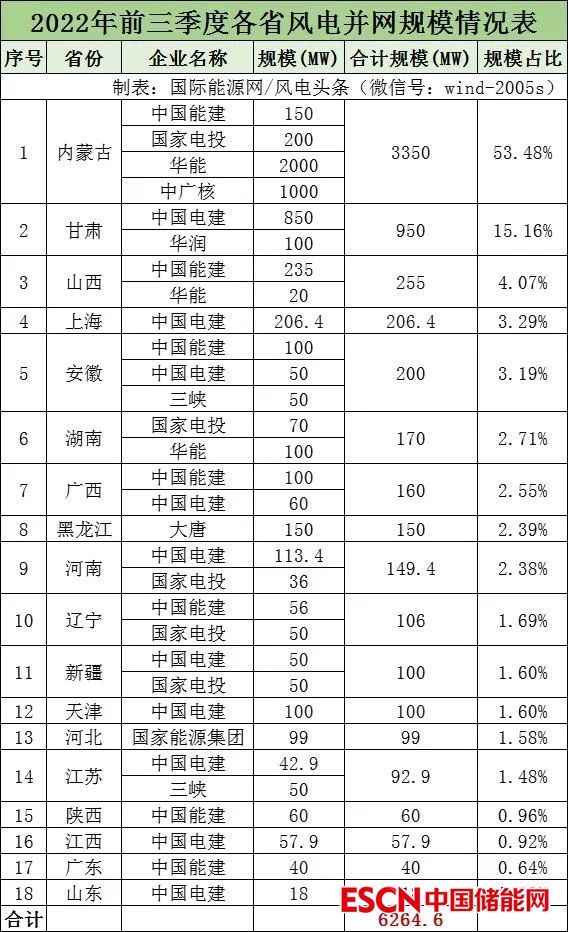 國際能源網(wǎng)/風電頭條(微信號:wind-2005s)通過梳理,2022年前三季度并網(wǎng)風電項目規(guī)模累計6264.6MW,其中內蒙古并網(wǎng)風電項目位列第一,規(guī)模達3350MW,甘肅省位列第二,規(guī)模為950MW,山西省位列第三,規(guī)模為255MW。
