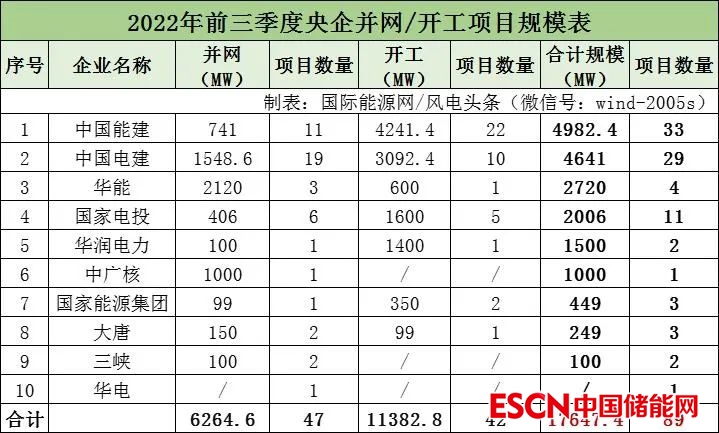 國際能源網(wǎng)/風電頭條(微信號:wind-2005s)梳理發(fā)現(xiàn),根據(jù)統(tǒng)計,2022年前三季度并網(wǎng)及開工風電項目規(guī)模超2GW的央企有中國能建、中國電建、華能、國家電投。并網(wǎng)及開工項目位列第一的央企是中國能建,裝機累計達4982.4MW,其次是中國電建,裝機達4641MW。