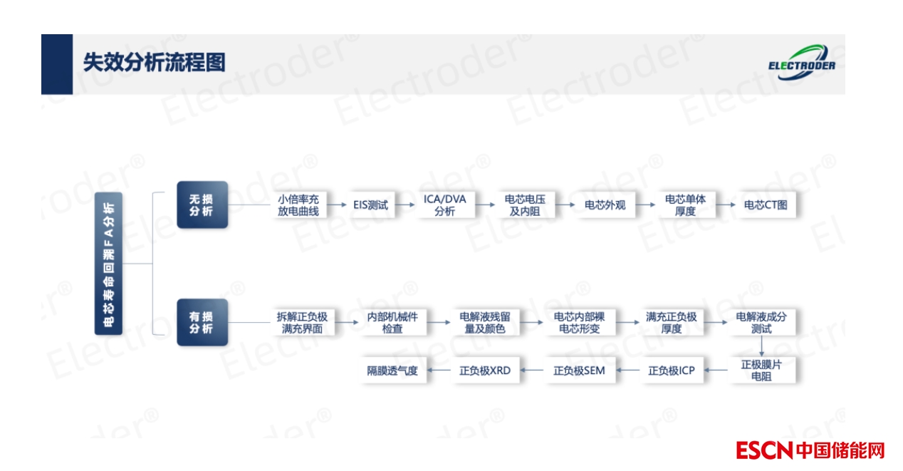 無(wú)損分析包括小倍率重放電曲線、EIS測(cè)試、電芯ICA/DVA測(cè)試、電芯電壓及內(nèi)阻、電芯外觀、電芯尺寸、電芯CT圖等環(huán)節(jié)。有損分析包括電極滿充界面、電芯機(jī)械件檢查、電解液殘留量及顏色、內(nèi)部卷芯形變確認(rèn)、陰陽(yáng)極厚度測(cè)量、電解液成分、正負(fù)極EDS等環(huán)節(jié)。