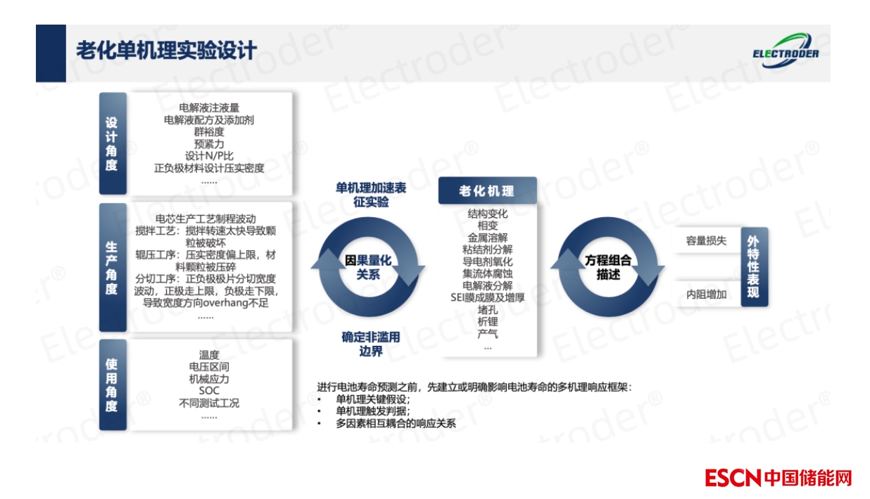 對(duì)此,第一步是要找到設(shè)計(jì)、生產(chǎn)、使用環(huán)節(jié)的變量與電池老化機(jī)理之間的因果量化關(guān)系。針對(duì)影響電池老化的因素,建立一套全面科學(xué)的失效分析流程。