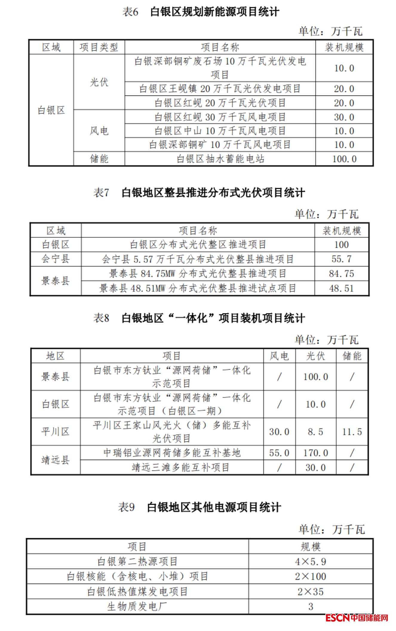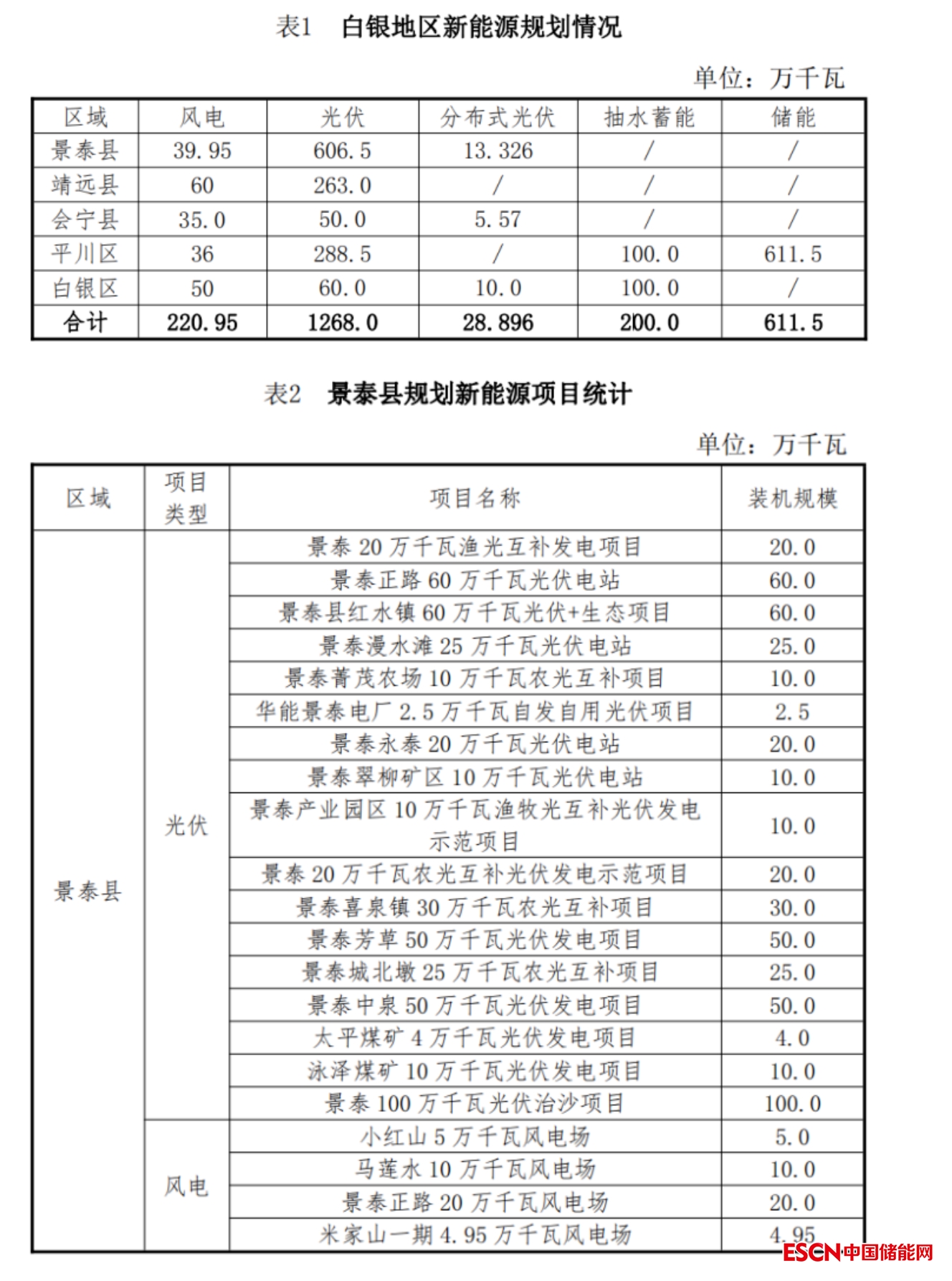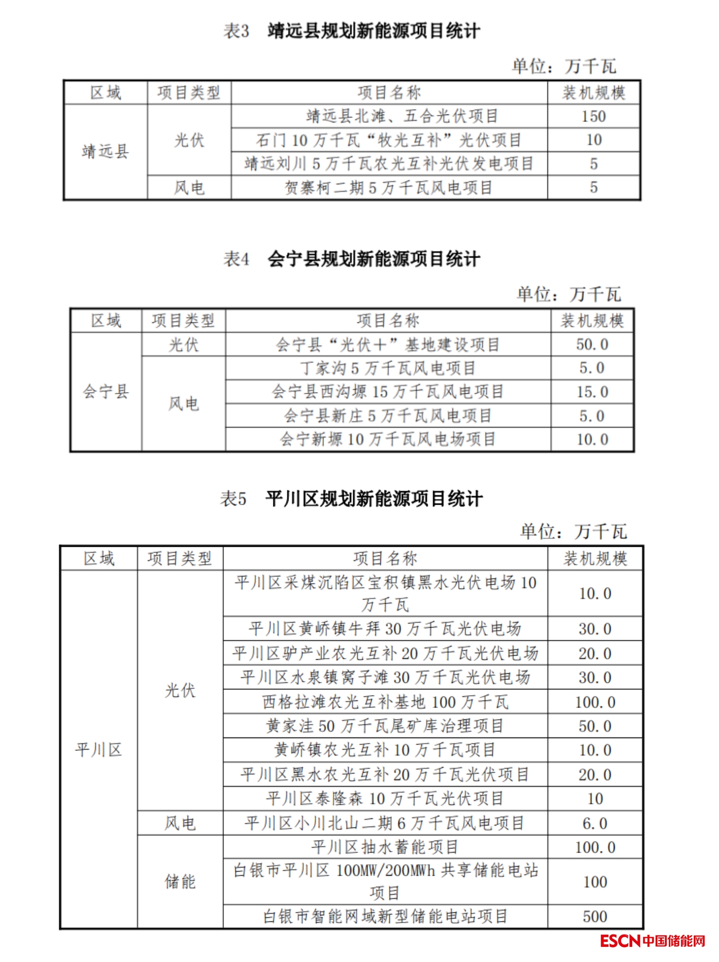 根據(jù)白銀地區(qū)能源規(guī)劃表,白銀市計劃在景泰縣、靖遠(yuǎn)縣、會寧縣、平川區(qū)以及白銀區(qū)規(guī)劃風(fēng)電220.95萬千瓦,光伏1268萬千瓦,分布式光伏28.896萬千瓦,抽水蓄能200萬千瓦以及儲能611.5萬千瓦。具體規(guī)劃情況以及項(xiàng)目名單如下: