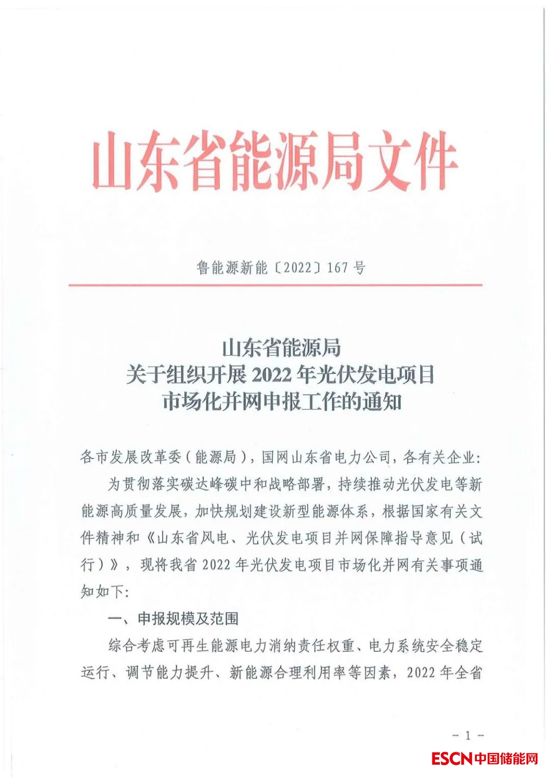 中國(guó)儲(chǔ)能網(wǎng)訊:10月28日,山東省能源局下發(fā)《關(guān)于組織開(kāi)展2022年光伏發(fā)電項(xiàng)目市場(chǎng)化并網(wǎng)申報(bào)工作的通知》,根據(jù)通知: