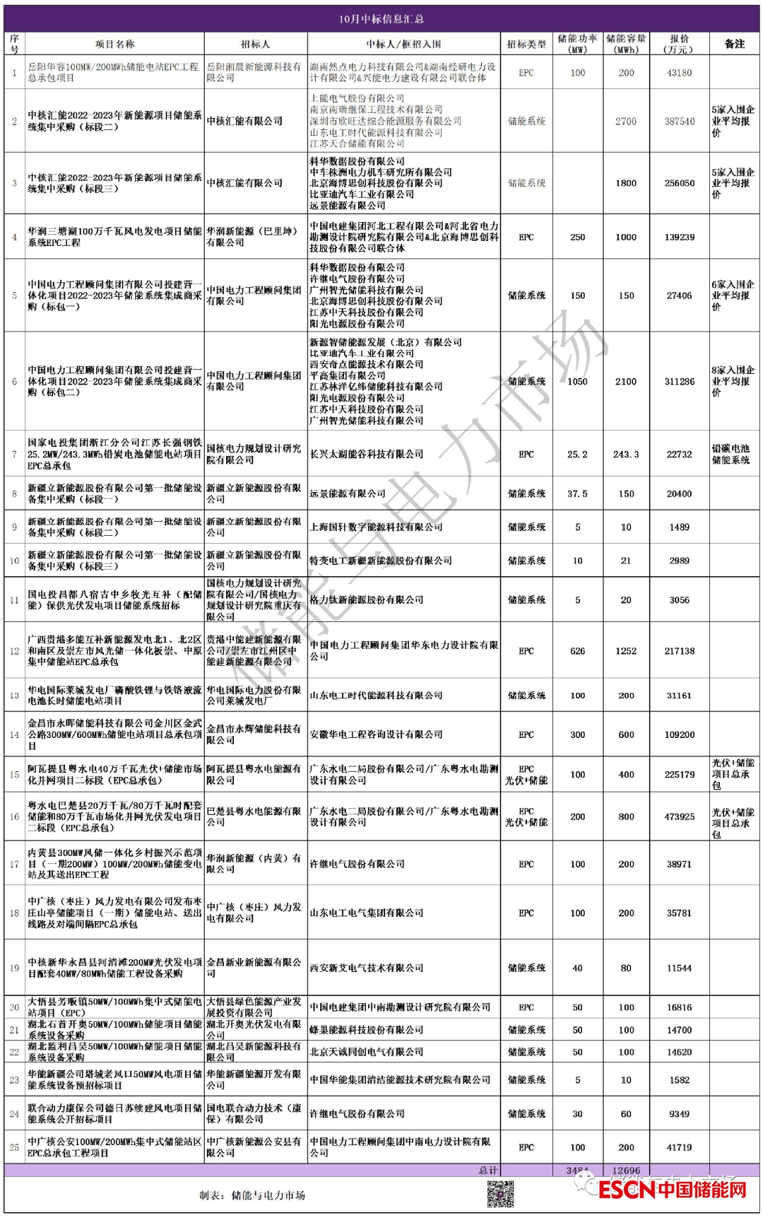 10月,經(jīng)儲(chǔ)能與電力市場公眾號(hào)報(bào)道過的項(xiàng)目中標(biāo)信息如下: