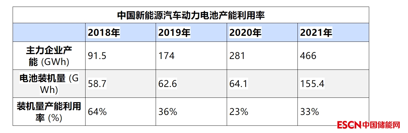目前,中國(guó)新能源汽車動(dòng)力電池產(chǎn)能利用率偏低,2021年主力動(dòng)力電池企業(yè)產(chǎn)能在年末達(dá)到466GWh,但裝機(jī)量需求155GWh,產(chǎn)能利用率只有33%。