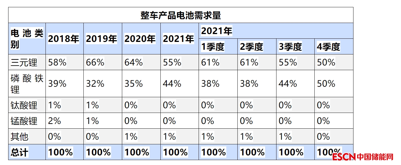 上表數(shù)據(jù)為電池電量的結(jié)構(gòu)占比數(shù)據(jù),2020年的三元電池占比達(dá)到64%,較2019年下降2個(gè)百分點(diǎn)。2021年1-12月三元鋰占比稍有下降,2021年4季度12月的三元鋰電池占比達(dá)到50%。磷酸鐵鋰保持穩(wěn)定。錳酸鋰的需求逐步減弱。鈦酸鋰基本沒有市場(chǎng)。
