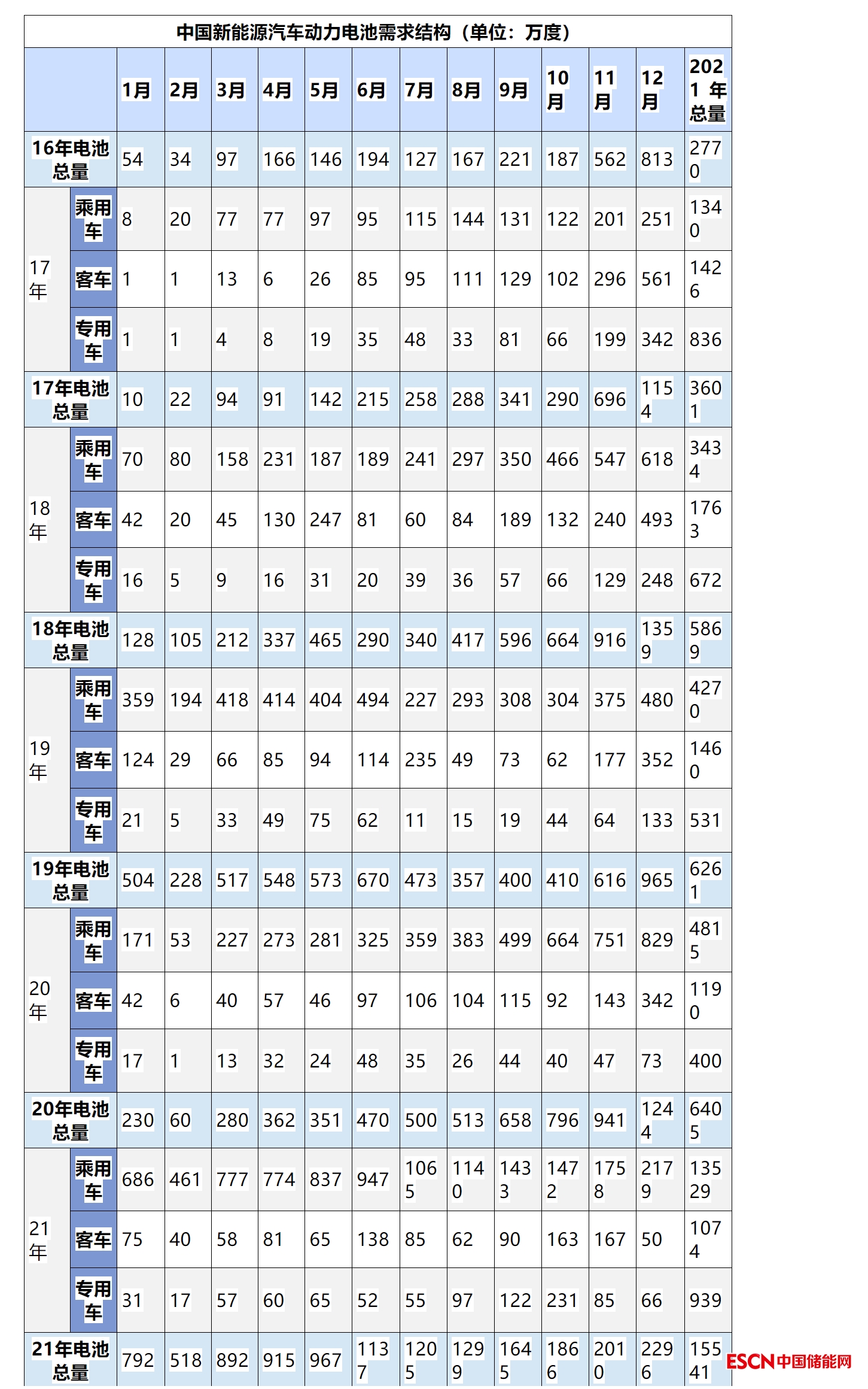 新能源汽車需求出現(xiàn)從客車為主的拉動(dòng)轉(zhuǎn)移到乘用車為主的變化。2021年動(dòng)力電池需求15542萬(wàn)度,大幅好于2020年的動(dòng)力電池6405萬(wàn)度需求。隨著2019年新能源補(bǔ)貼退坡前后的干擾因素消失,2020年7-12月和2021年的的動(dòng)力電池需求相對(duì)較強(qiáng)。