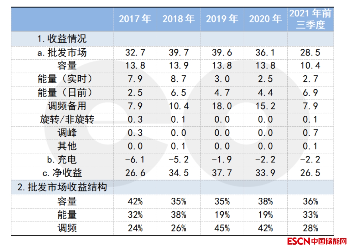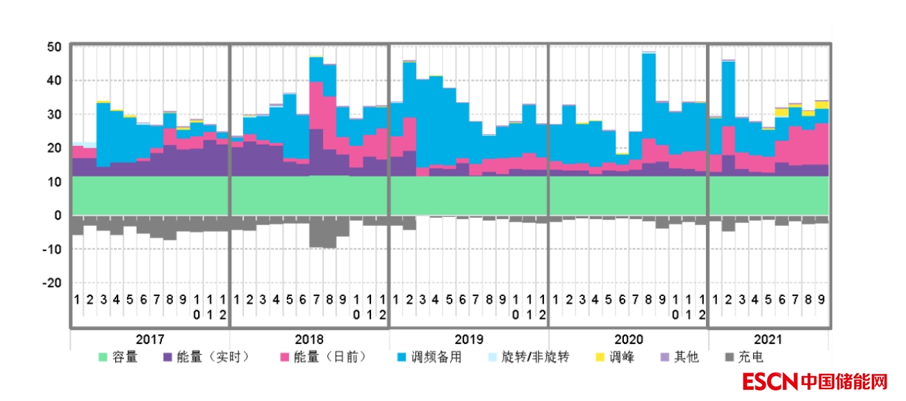 自2021年起,儲能項目從能量轉(zhuǎn)移和價格套利服務(wù)中獲得的收入,比調(diào)頻收入更多。這是因為調(diào)頻價格在2020年和2019年較高,但在2021年有所下降。由于未來輔助服務(wù)收入回報可能會更低,儲能運(yùn)營商正在尋找其他機(jī)會。