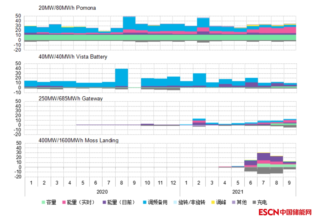 圖4 幾個容量較大的儲能項目各月收益(單位:千美元/MW)