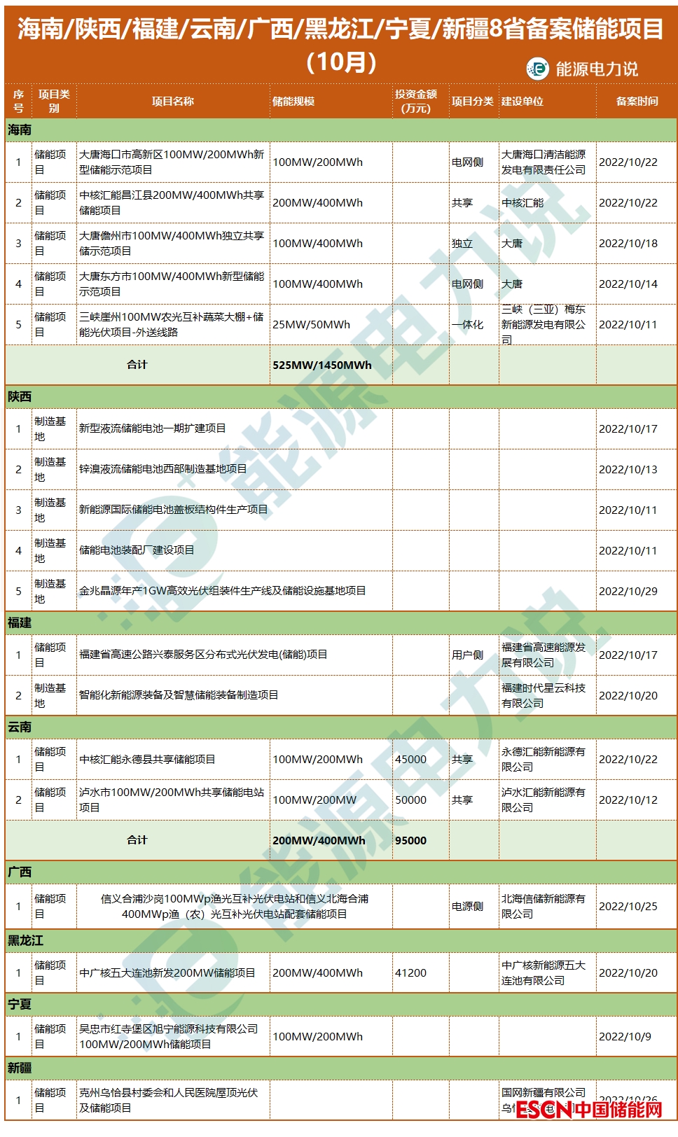 10月,海南、陜西、福建、等多省均有備案儲能項目。其中海南省備案儲能項目5個,總?cè)萘考s1.5GWh,建設(shè)單位包括大唐、三峽、中核等旗下公司。