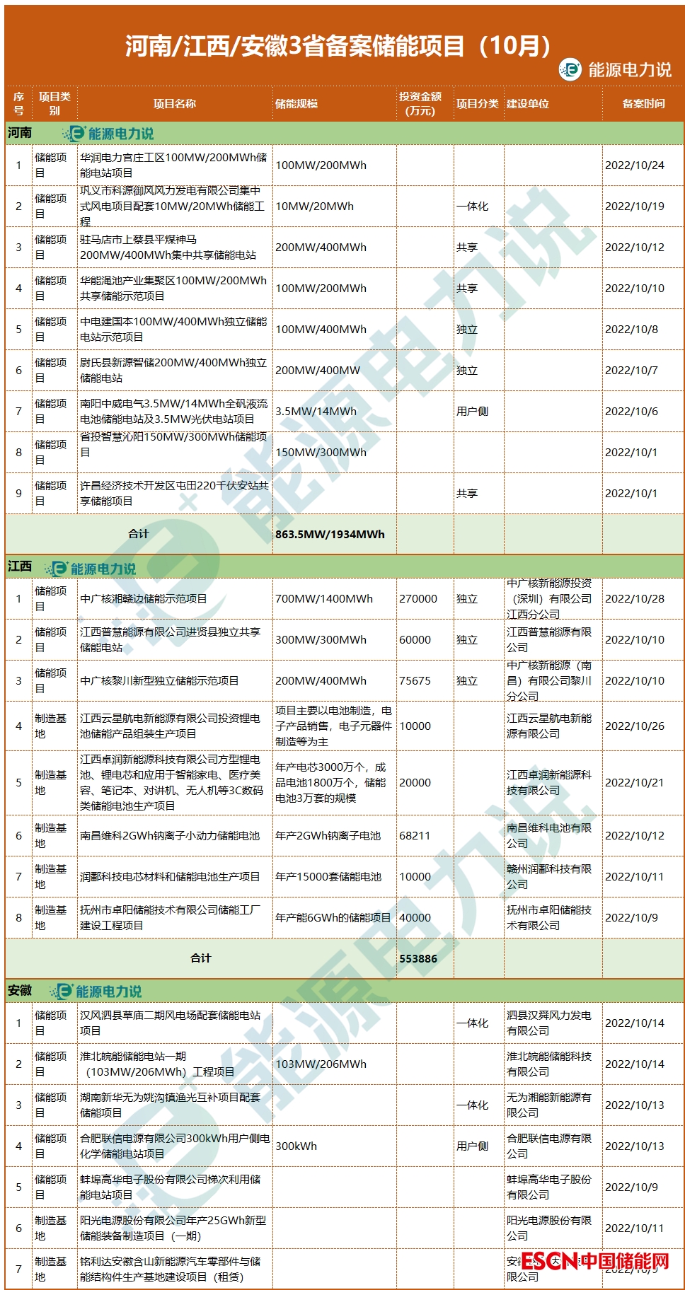 10月,河南省備案儲能項目9個,總?cè)萘考s1.9GWh。江西省儲能項目3個,均為獨(dú)立儲能,總?cè)萘考s2.1GWh,總投資約40.6億元,建設(shè)單位為中廣核新能源公司、江西普慧能源公司;儲能產(chǎn)品制造項目5個,設(shè)計儲能電池、動力儲能電池、電芯材料等的制造生產(chǎn)。安徽省備案儲能項目4個,儲能產(chǎn)品制造項目3個。