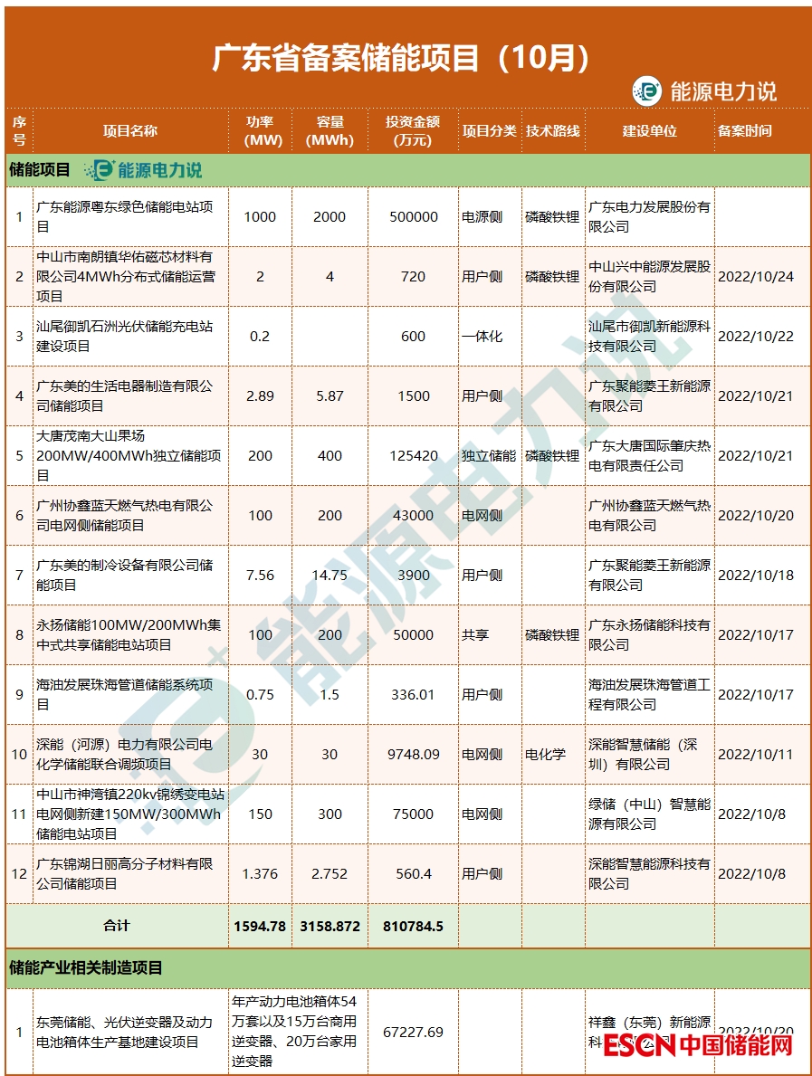 10月,廣東省備案儲能項目13個,其中儲能項目12個,儲能產(chǎn)品制造基地項目1個。
