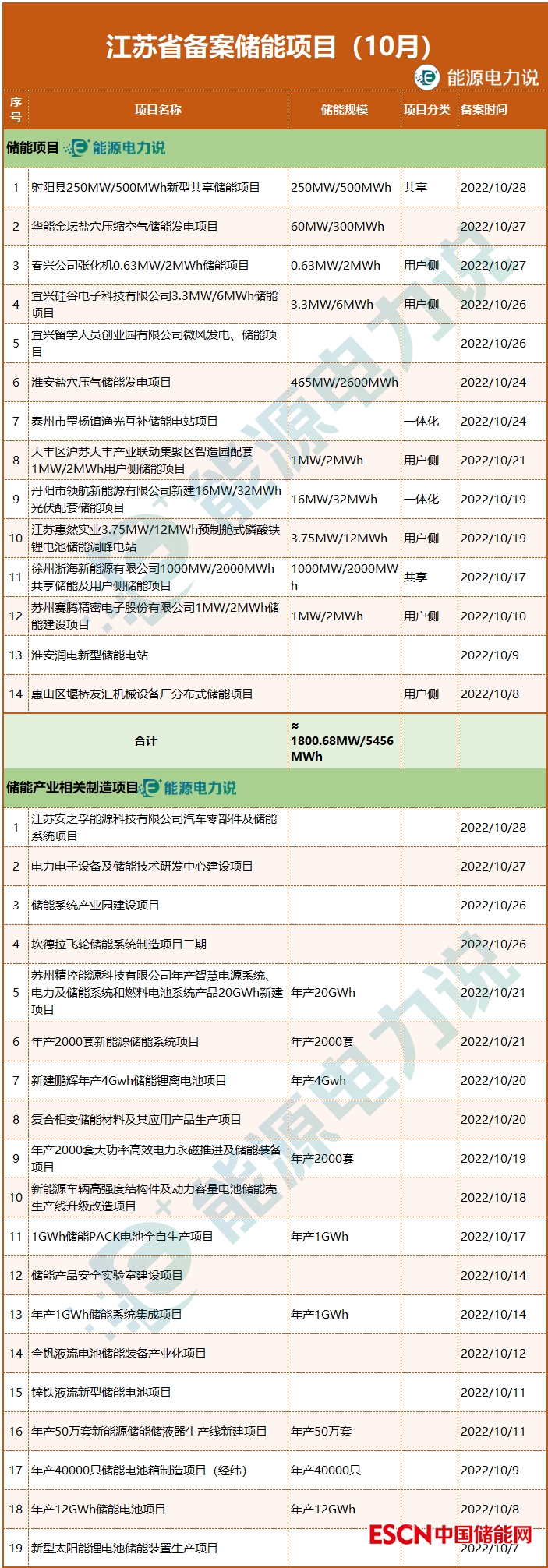 10月,江蘇省備案儲能項目33個,其中儲能項目14個,儲能產(chǎn)品制造基地項目19個。