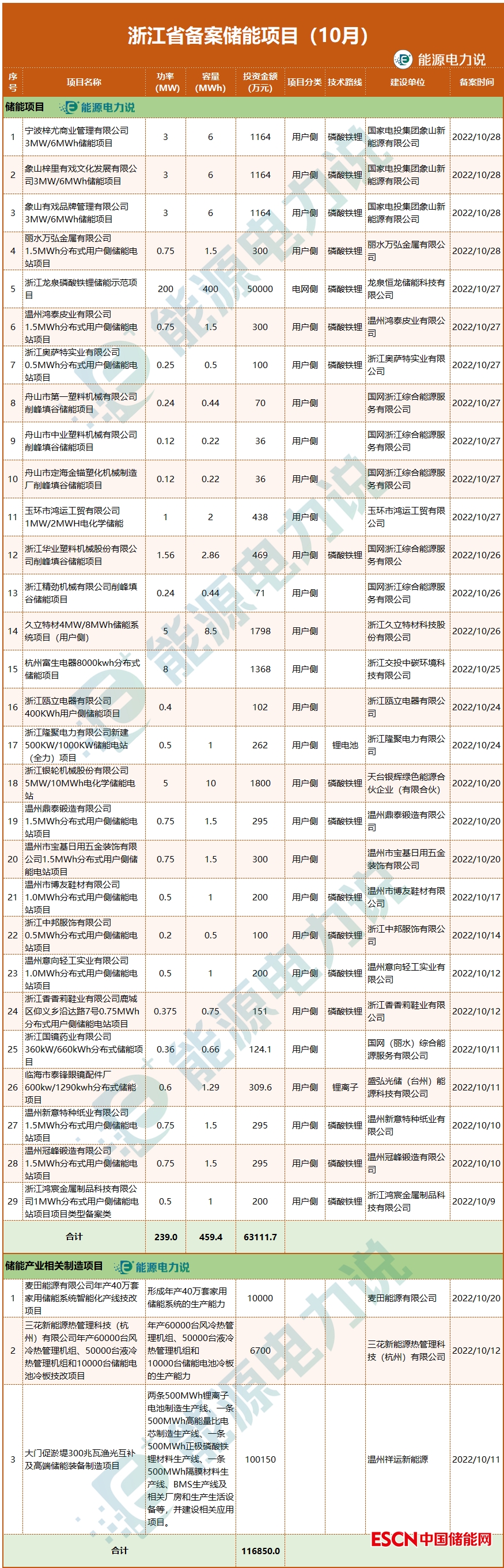 10月,浙江省備案儲能項目32個,其中儲能項目29個,儲能產(chǎn)品制造基地項目3個。