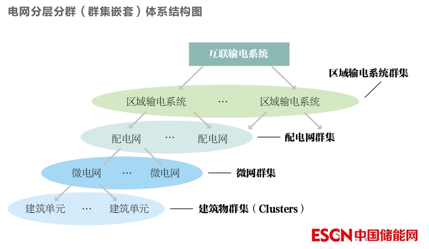 互聯(lián)輸電系統(tǒng)是若干個(gè)平衡區(qū)(即區(qū)域性輸電網(wǎng))互聯(lián)起來的群集(clusters),每個(gè)平衡區(qū)是一個(gè)集群;每個(gè)區(qū)域性輸電網(wǎng)是若干個(gè)配電網(wǎng)互聯(lián)起來的群集,每個(gè)配電網(wǎng)是若干個(gè)微網(wǎng)、建筑單元組成的群集,每個(gè)微網(wǎng)又可以是由若干個(gè)建筑單元互聯(lián)起來的群集,由此形成多層的群集層次結(jié)構(gòu)。如果這個(gè)圖扁平化,則形成群集嵌套。
