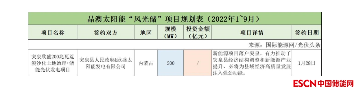 截至2022年9月30日,晶澳太陽能共簽約(規(guī)劃)1個(gè)風(fēng)光儲項(xiàng)目,項(xiàng)目規(guī)模為200MW。