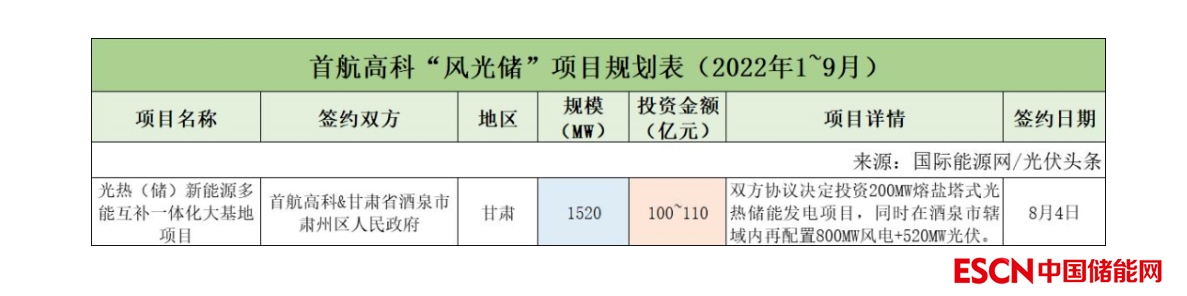 截至2022年9月30日,首航高科共簽約(規(guī)劃)1個(gè)風(fēng)光儲項(xiàng)目,項(xiàng)目規(guī)模為1.52GW,投資金額為100~110億元(注:統(tǒng)計(jì)時(shí)取值110億元)。