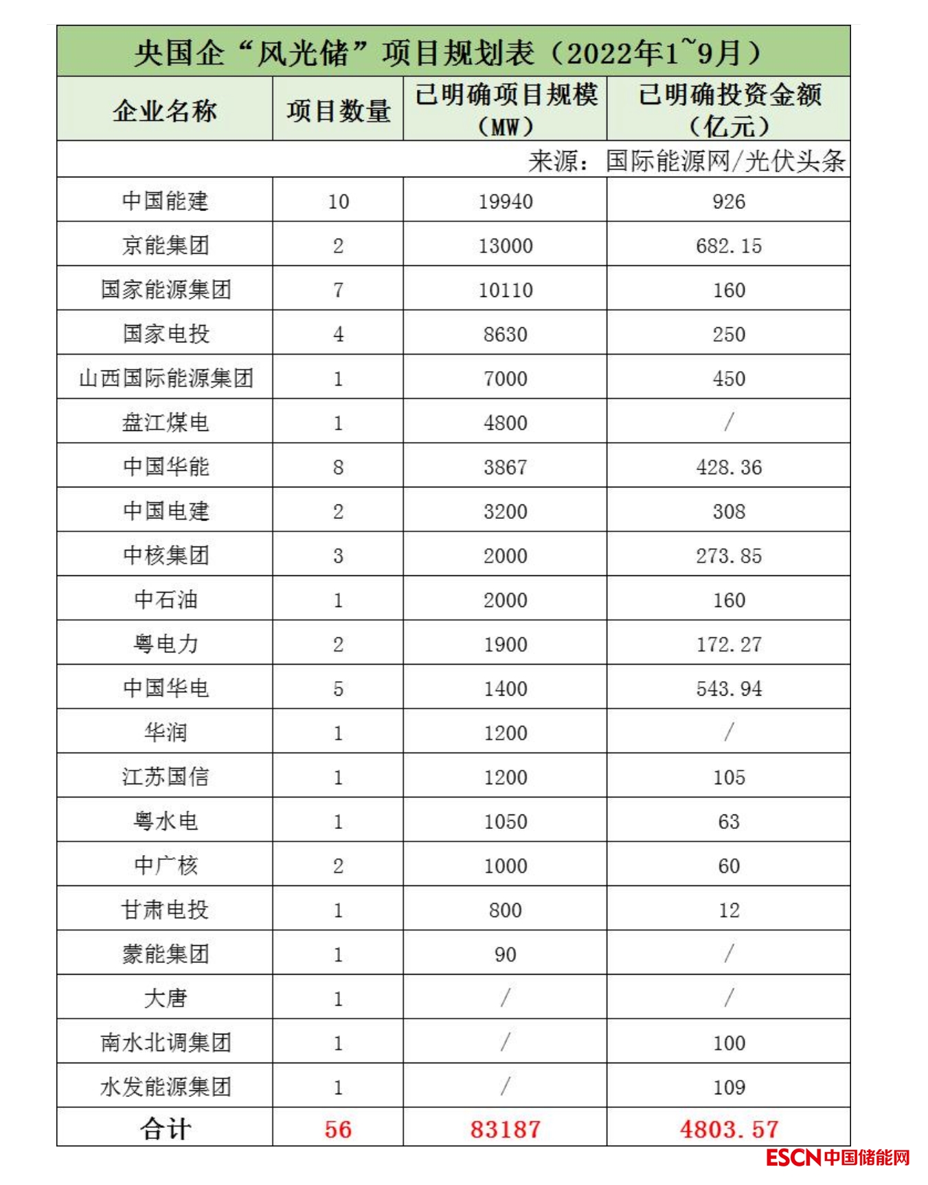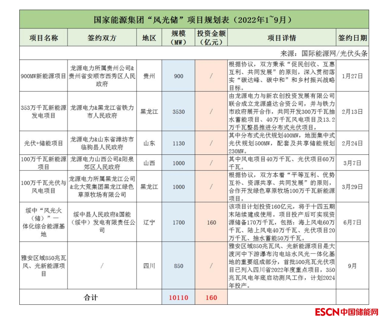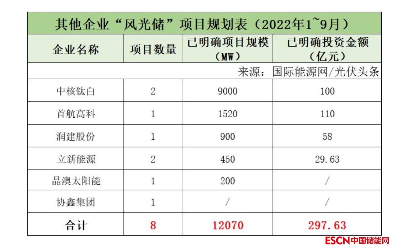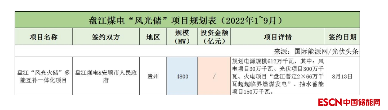 截至2022年9月30日,國家能源集團(tuán)共簽約(規(guī)劃)7個(gè)風(fēng)光儲項(xiàng)目,明確項(xiàng)目規(guī)模共計(jì)10.11GW,有1個(gè)項(xiàng)目明確投資金額160億元。