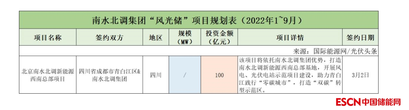 截至2022年9月30日,南水北調(diào)集團(tuán)共簽約(規(guī)劃)1個(gè)風(fēng)光儲項(xiàng)目,投資金額為100億元。