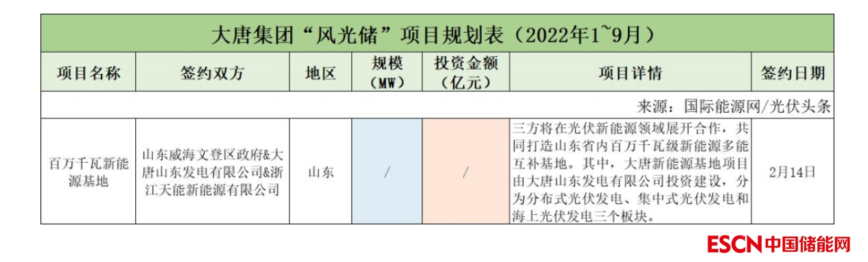 截至2022年9月30日,大唐集團(tuán)共簽約(規(guī)劃)1個(gè)風(fēng)光儲項(xiàng)目,該項(xiàng)目只簽署了合作協(xié)議。