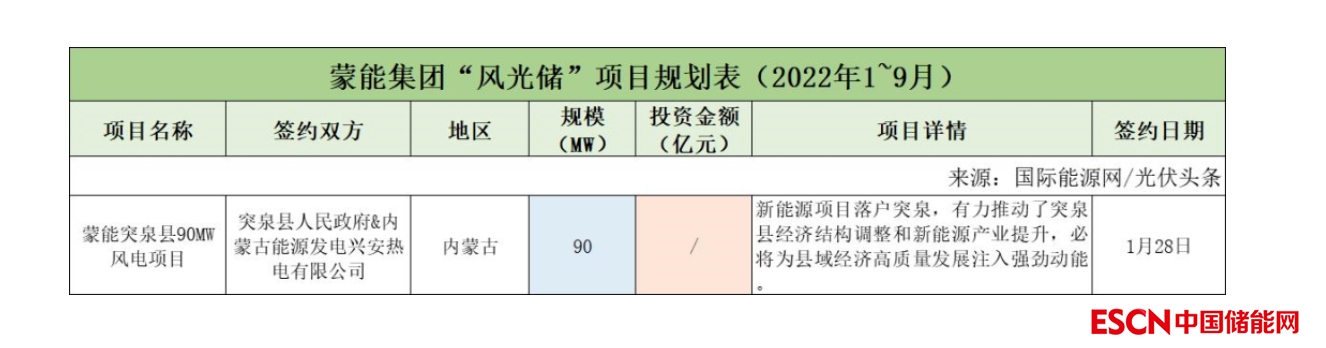 截至2022年9月30日,蒙能集團(tuán)共簽約(規(guī)劃)1個(gè)風(fēng)光儲項(xiàng)目,項(xiàng)目規(guī)模為90MW。