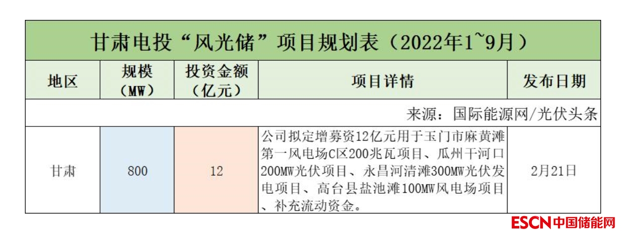 截至2022年9月30日,甘肅電投共規(guī)劃1個(gè)風(fēng)光儲項(xiàng)目,項(xiàng)目規(guī)模為800MW,投資金額12億元。