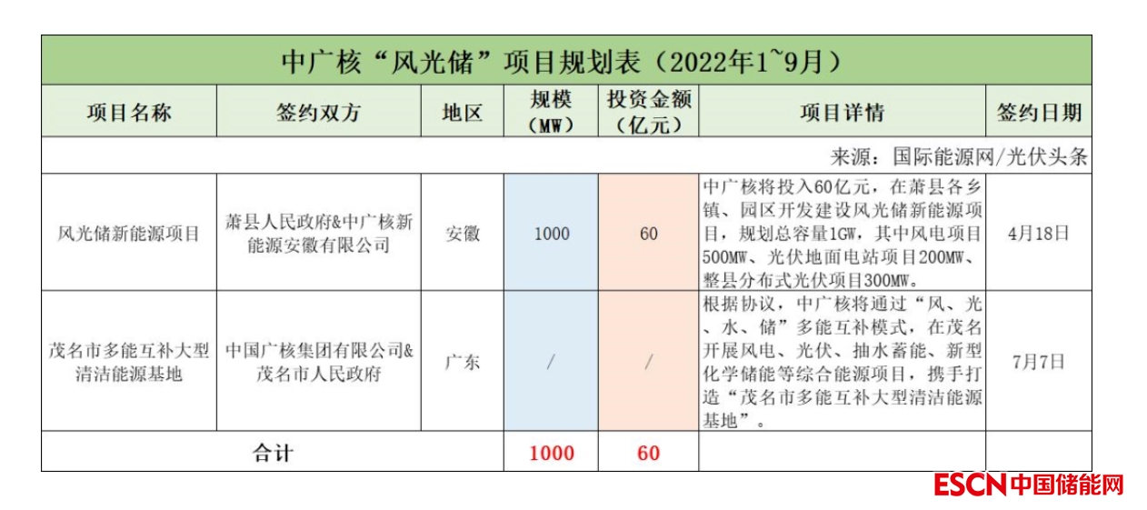 截至2022年9月30日,中廣核共簽約(規(guī)劃)2個(gè)風(fēng)光儲項(xiàng)目,其中已明確項(xiàng)目規(guī)模為1GW,有1個(gè)項(xiàng)目明確投資金額60億元。