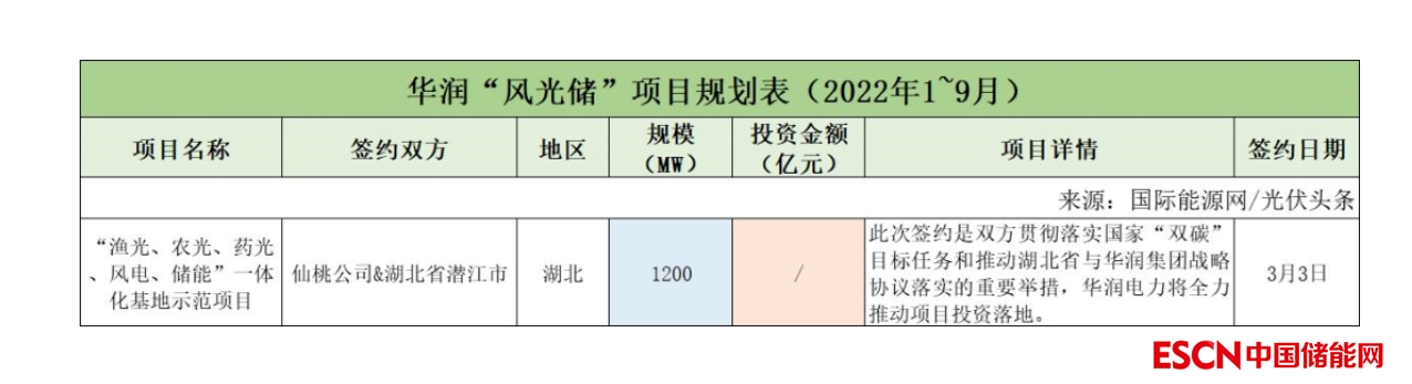 截至2022年9月30日,華潤共簽約(規(guī)劃)1個(gè)風(fēng)光儲項(xiàng)目,項(xiàng)目規(guī)模1.2GW。