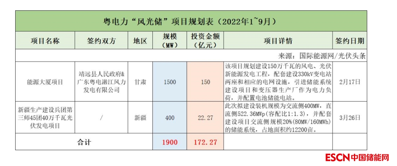 截至2022年9月30日,粵電力共簽約(規(guī)劃)2個(gè)風(fēng)光儲項(xiàng)目,明確規(guī)模共計(jì)1.9GW,明確投資金額共計(jì)172.27億元。