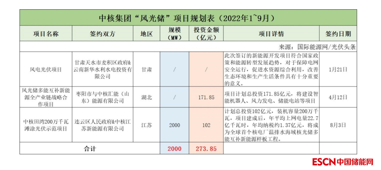 截至2022年9月30日,中核集團(tuán)共簽約(規(guī)劃)3個(gè)風(fēng)光儲項(xiàng)目,明確規(guī)模共計(jì)2GW。其中有2個(gè)項(xiàng)目明確投資金額273.85億元。