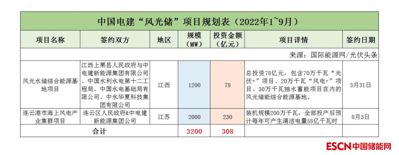 截至2022年9月30日,中國電建共簽約(規(guī)劃)2個(gè)風(fēng)光儲項(xiàng)目,其中已明確項(xiàng)目規(guī)模為3.2GW,明確投資金額308億元。