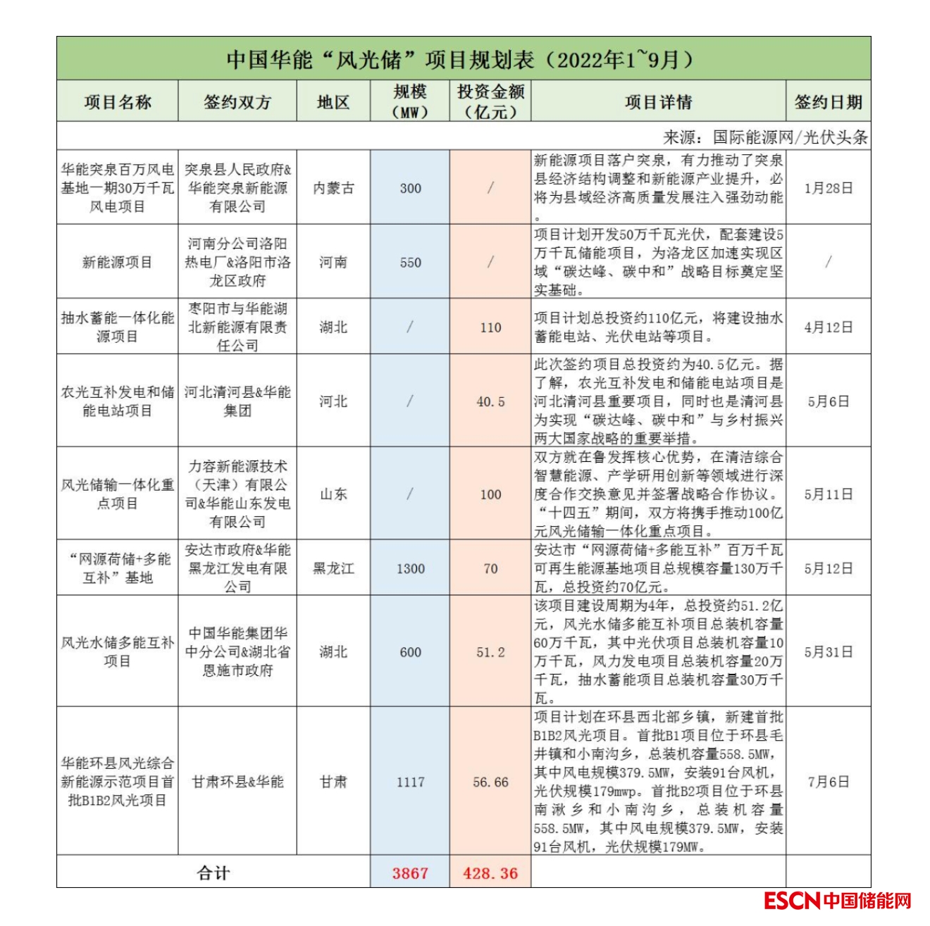 截至2022年9月30日,華能共簽約(規(guī)劃)8個(gè)風(fēng)光儲項(xiàng)目,明確規(guī)模共計(jì)3.867GW,有6個(gè)項(xiàng)目明確投資金額共計(jì)428.36億元。